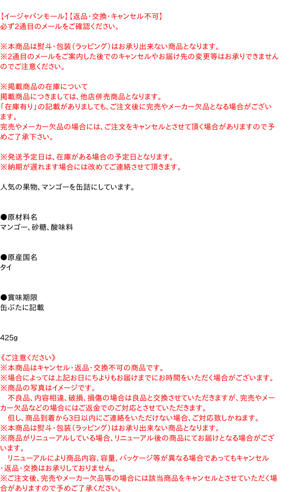 ●原材料名 マンゴー、砂糖、酸味料 ●原産国名 タイ ●賞味期限 缶ぶたに記載 425g【メーカー・製造または販売元】谷尾食糧工業株式会社0120-75-8882【広告文責】株式会社イージャパンアンドカンパニーズ 072-875-6666《ご注意ください》 ※本商品はキャンセル・返品・交換不可の商品です。