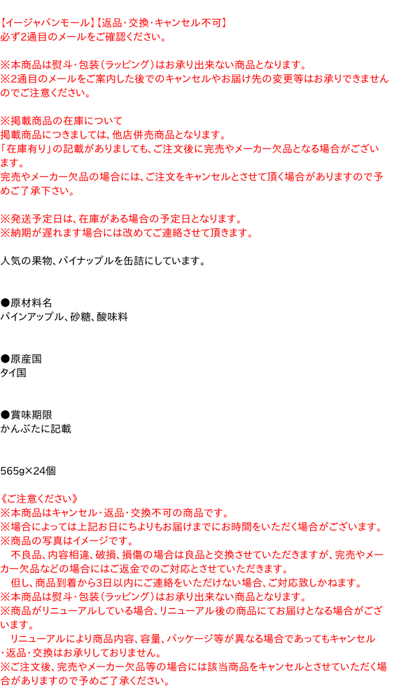 ●原材料名 パインアップル、砂糖、酸味料 ●原産国 タイ国 ●賞味期限 かんぶたに記載 565g×24個【メーカー・製造または販売元】谷尾食糧工業株式会社0120-75-8882【広告文責】株式会社イージャパンアンドカンパニーズ 072-875-6666《ご注意ください》 ※本商品はキャンセル・返品・交換不可の商品です。